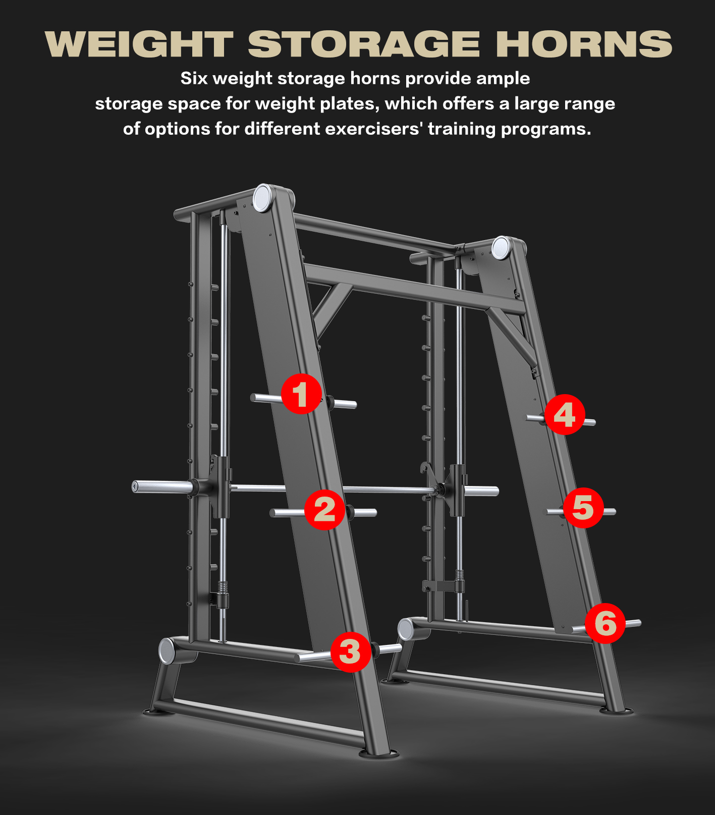 2、Multiple locking positions allow users to stop training by rotating the Smith bar at any point during process of the exercise,