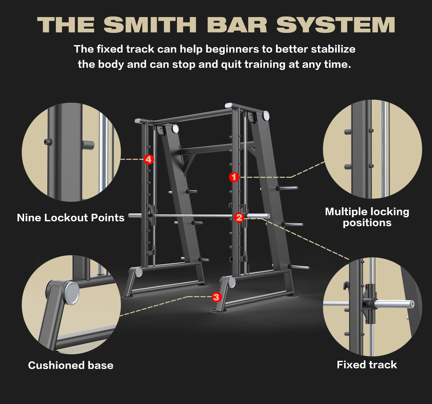 2、Multiple locking positions allow users to stop training by rotating the Smith bar at any point during process of the exercise,